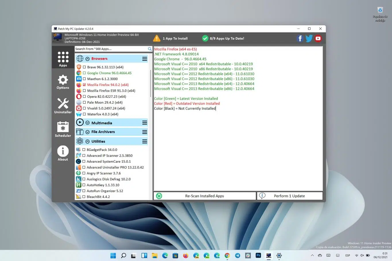 El programa analiza las versiones instaladas y las compara con las últimas disponibles. Para que lo veas de un vistazo, usa un código de colores: en rojo lo desactualizado, en verde lo que va al día y en negro aquello que no está instalado. Esta visual ayuda a decidir en segundos qué actualizar o instalar desde la misma ventana.