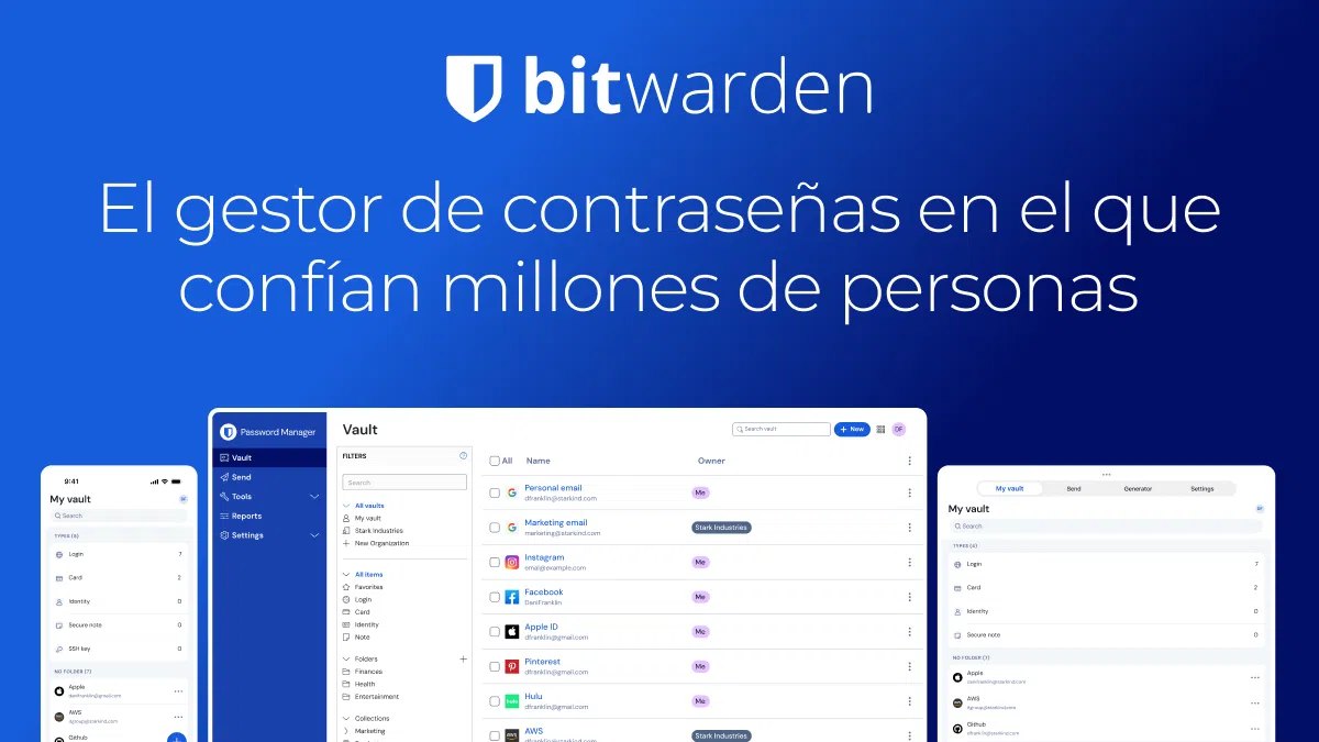 Bitwarden destaca porque combina un enfoque de cifrado de conocimiento cero, cumplimiento de estándares internacionales y una comunidad muy activa, con aplicaciones para navegador, escritorio y móvil. Con él puedes administrar tus contraseñas, generar claves robustas, compartirlas de forma segura e incluso gestionar usuarios dentro de equipos y empresas, todo con una estructura muy clara basada en bóvedas, carpetas y colecciones.