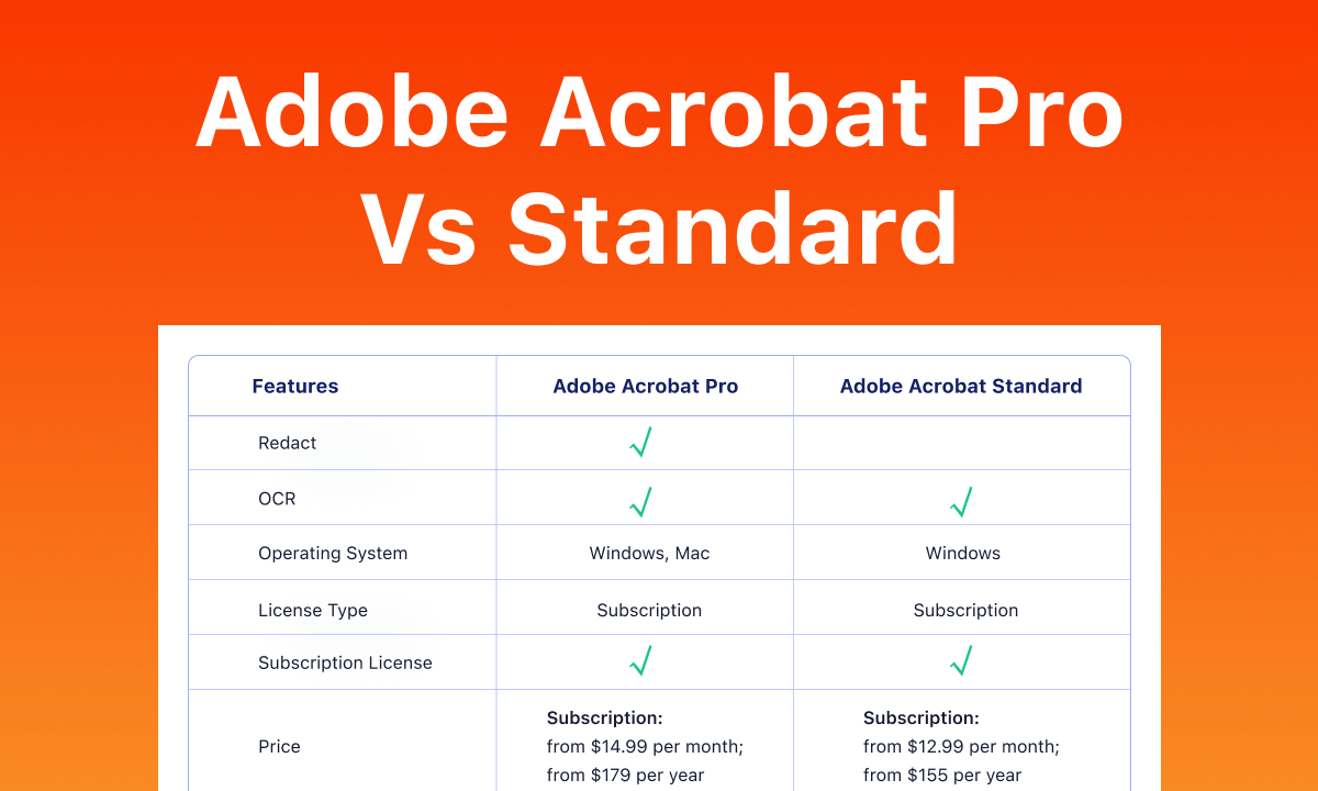En cuanto a precios orientativos, Acrobat Standard DC suele situarse en torno a 12,99 USD al mes, mientras que Acrobat Pro DC ronda los 14,99-19,99 USD al mes dependiendo de la región, promoción o si se contrata dentro de Creative Cloud.