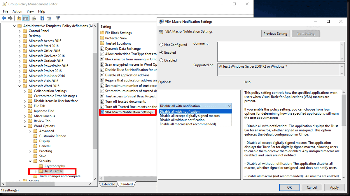 - Configuración de usuario > Plantillas administrativas > Microsoft Word 2016 > Opciones de Word > Seguridad > Centro de confianza.