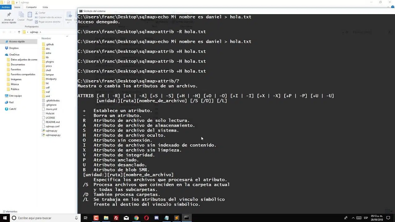 Los principales modificadores de attrib son letras que representan atributos. Siempre se usan con + para añadir el atributo o – para quitarlo. Vamos uno por uno: