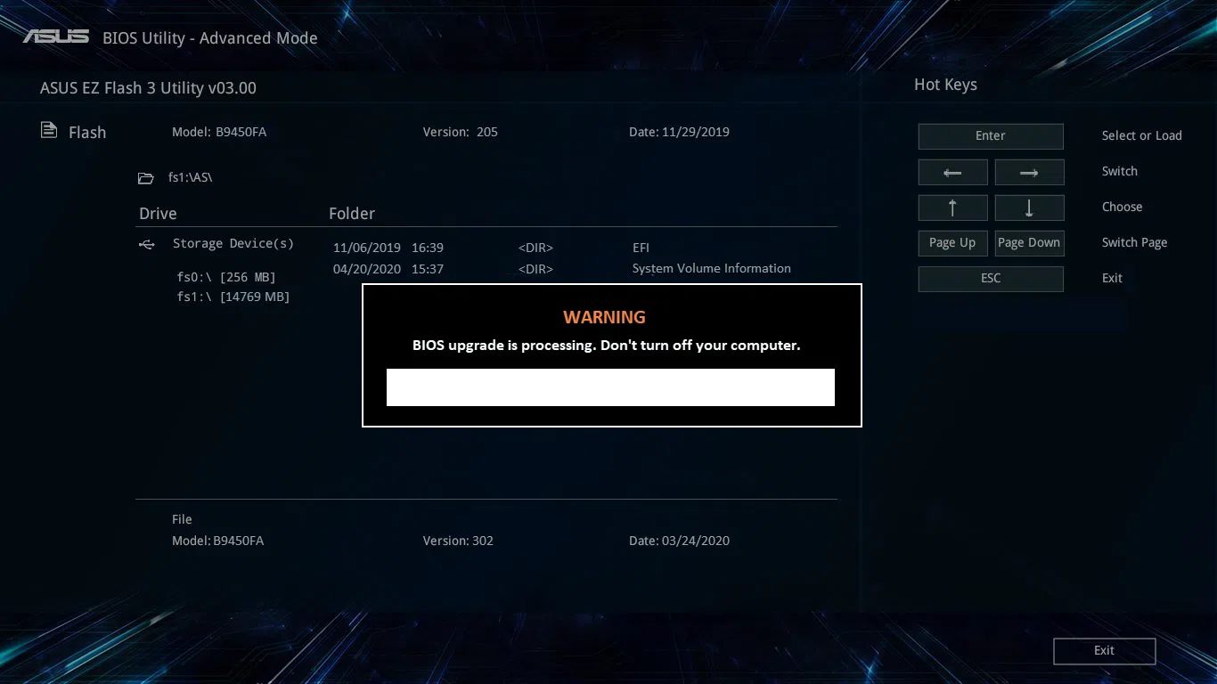 - Confirma que quieres proceder con la actualización cuando la BIOS te lo pregunte, revisando que modelo y versión son correctos.