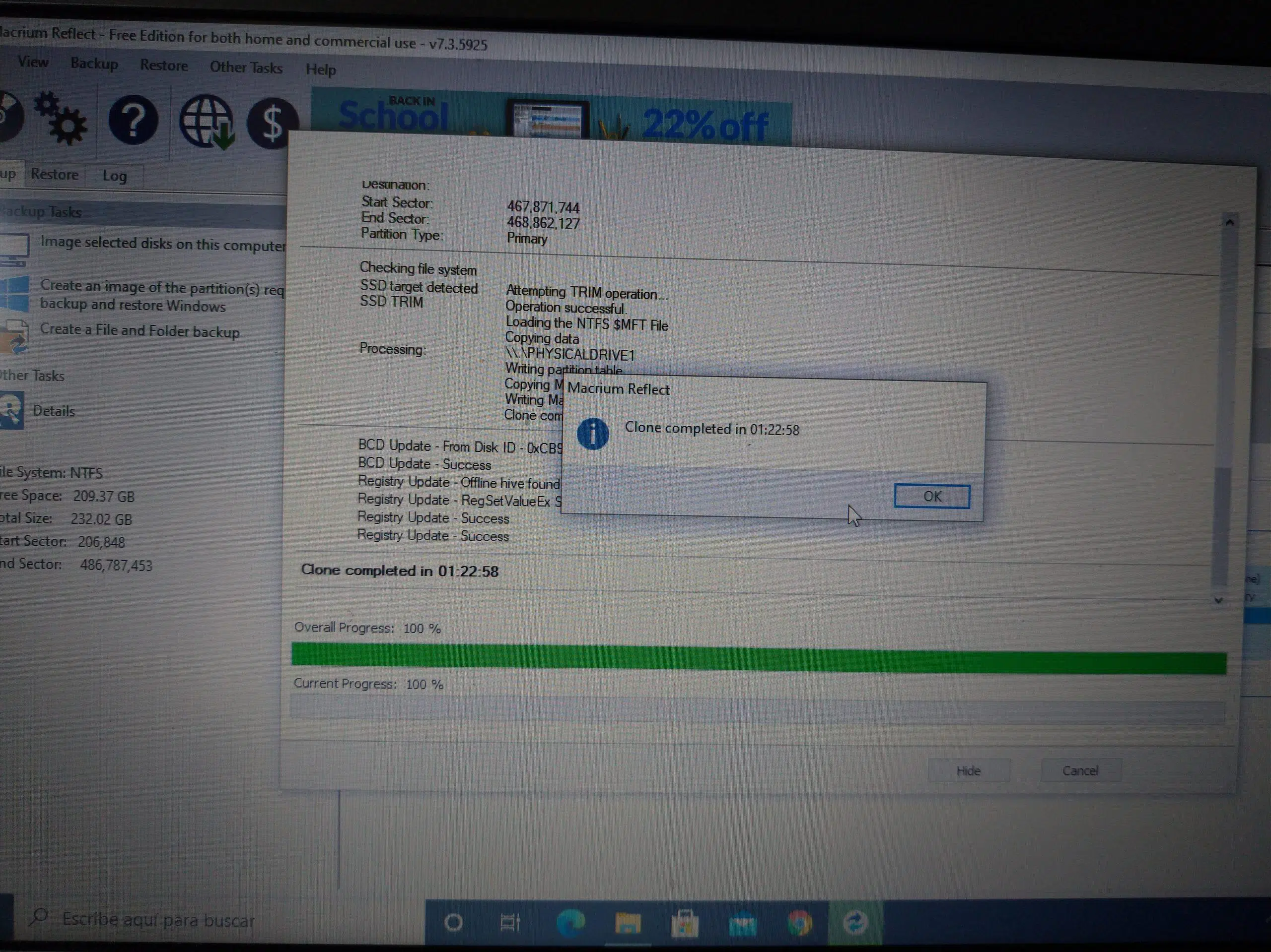 El tiempo total dependerá de la velocidad de tus discos (HDD vs SSD/NVMe), del bus (SATA vs PCIe) y del volumen de datos a copiar. Como referencia, más de una hora es habitual en equipos con mucha información o en HDD lentos.