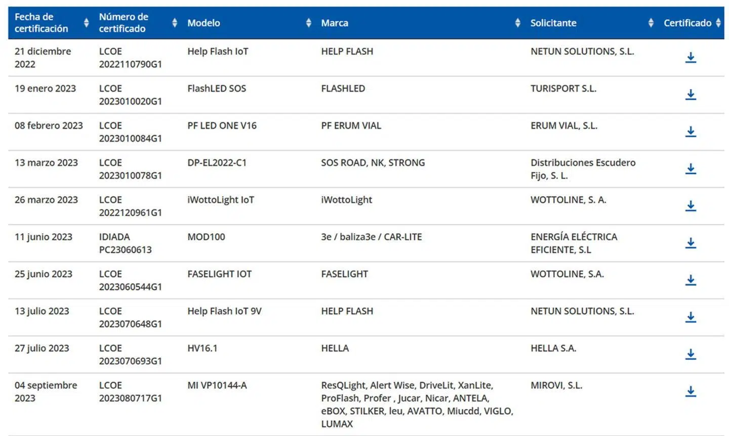 En ese listado aparecen dispositivos muy conocidos como Help Flash IoT de Netun Solutions, FlashLED SOS y FlashLED SOS RACC de Turisport, FASELIGHT IoT e iWottoLight IoT de Wottoline, HV16.1 de HELLA, OSRAM LEDguardian Road Flare V16 IoT, RV7000 de SOSTRAFFIC/Blueshield49/CEGASA, Claim Light NB IoT de Speed Sound, así como toda la familia de modelos IoT de Ledel Solutions, Limburg Technology, Premier Auto Accessory y muchas más marcas. También se listan variantes específicas para fabricantes de automóviles como SEAT, CUPRA, BMW, AUDI o PORSCHE.