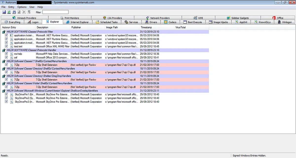 Entre las ubicaciones que Autoruns es capaz de revisar se encuentran las carpetas de inicio, las claves Run y RunOnce del Registro (para todos los usuarios y por usuario), numerosas claves adicionales de persistencia, así como elementos menos obvios: extensiones de shell del Explorador, barras de herramientas, Browser Helper Objects (BHOs), DLLs de AppInit, “image hijacks” (secuestros de ejecutables), imágenes de arranque, DLL de notificación de Winlogon, servicios de inicio automático, proveedores de servicios en capas (LSP) de Winsock, códecs multimedia, entradas WMI y mucho más.