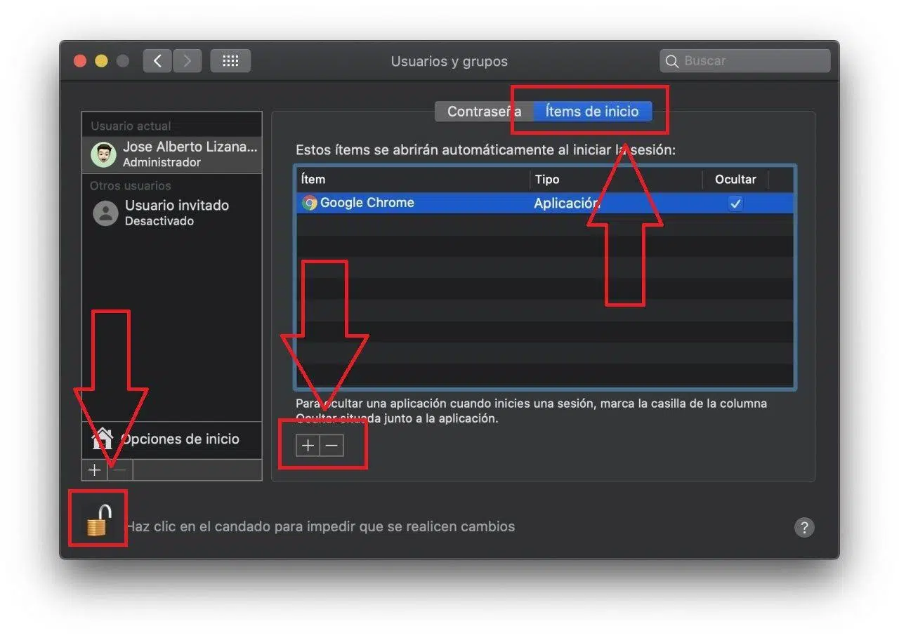 - Anota lo que aparece en “Abrir al iniciar sesión”. Luego, quítalo todo temporalmente (botón “–”).