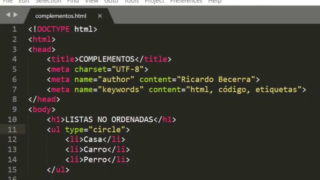 Una lista desordenada define elementos relacionados sin jerarquía ordinal y es conceptualmente parecida a listas en otras aplicaciones, como listas desplegables en Excel. Por defecto aparece con un punto «disc», pero puedes cambiar su viñeta con list-style-type: none (sin viñeta), disc (rellena), circle (hueca) o square (cuadrada).