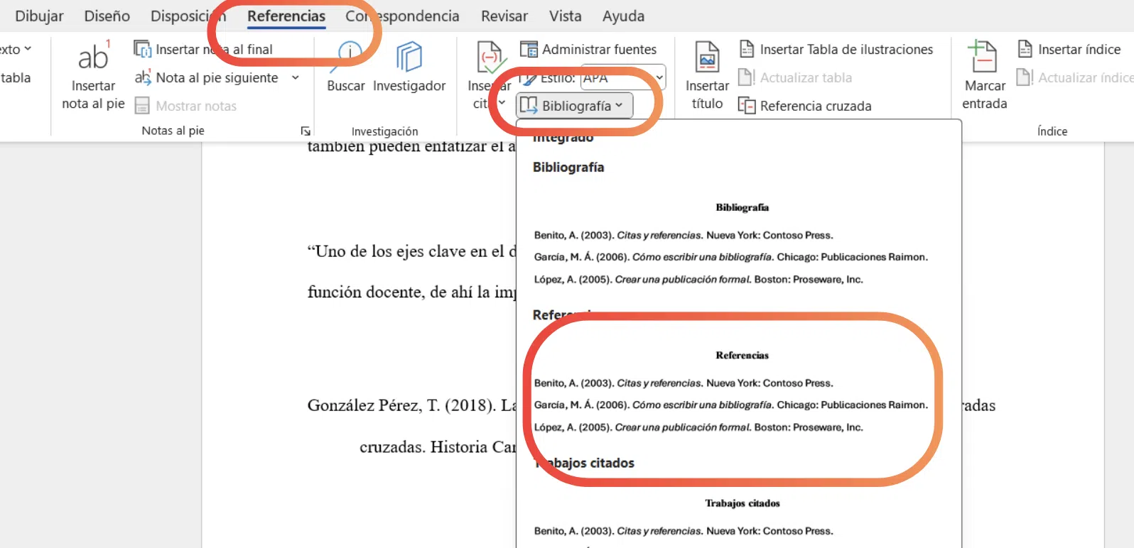 Cuando hayas terminado de insertar todas tus citas dentro del texto, llega el momento de generar la bibliografía al final del documento. Aquí Word se luce, porque construye la lista automáticamente a partir de las fuentes que ya has usado.