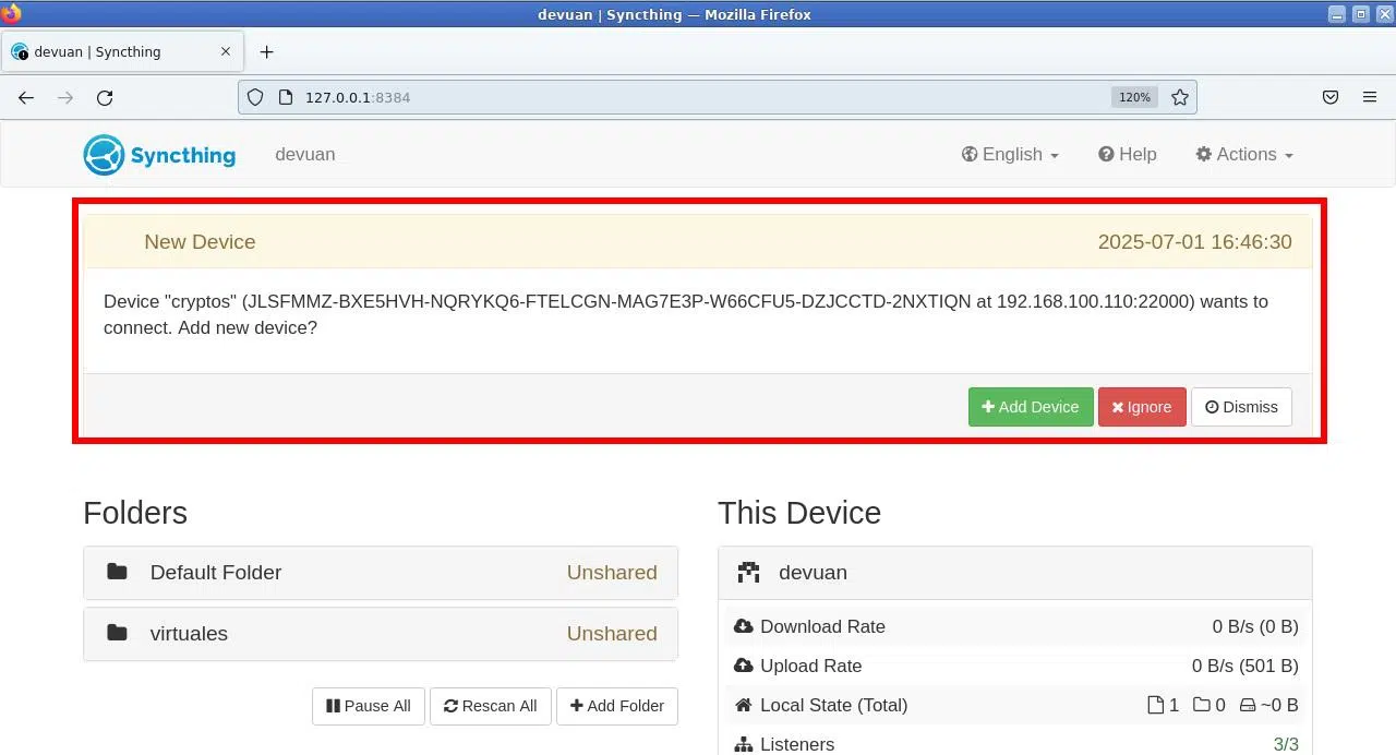 Abre tu navegador en la máquina local y visita la consola: http://127.0.0.1:8384/. La primera vez te pedirá definir autenticación de acceso, algo muy recomendable para evitar sustos.