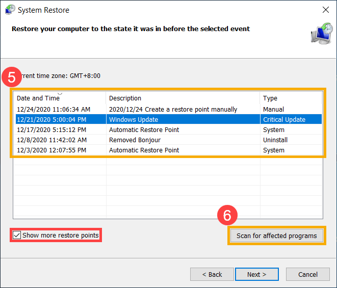 - Sigue el asistente para seleccionar un punto de restauración creado antes de la actualización del driver problemática.