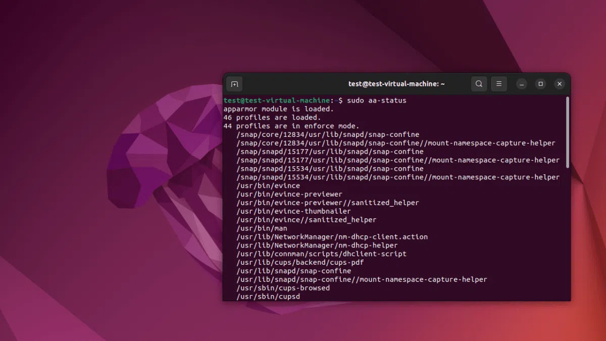 La salida de aa-status muestra, entre otras cosas, el número de perfiles cargados, cuántos están en modo enforce, cuántos en modo complain y el listado de rutas asociadas a cada uno. Esta información es muy útil para tener una foto rápida del nivel de protección real que aporta AppArmor en tu máquina.