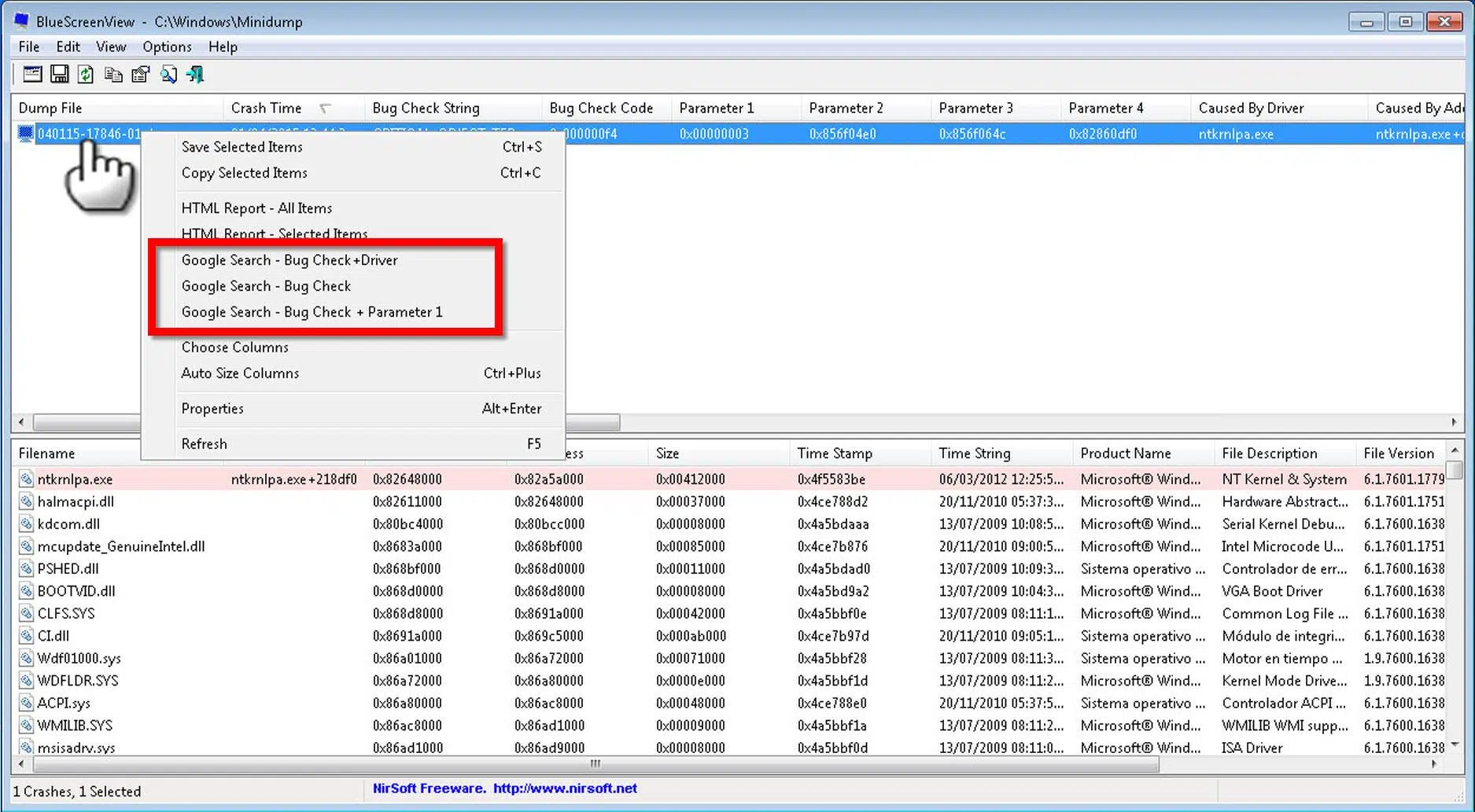 BlueScreenView marca en rojo los elementos sospechosos, es decir, los que probablemente hayan detonado el error. Fíjate en la columna “Caused By Driver”: allí verás el nombre del módulo que ha provocado la caída, por ejemplo ntoskrnl.exe o variantes como ntkrnlpa.exe cuando el núcleo del sistema está involucrado.
