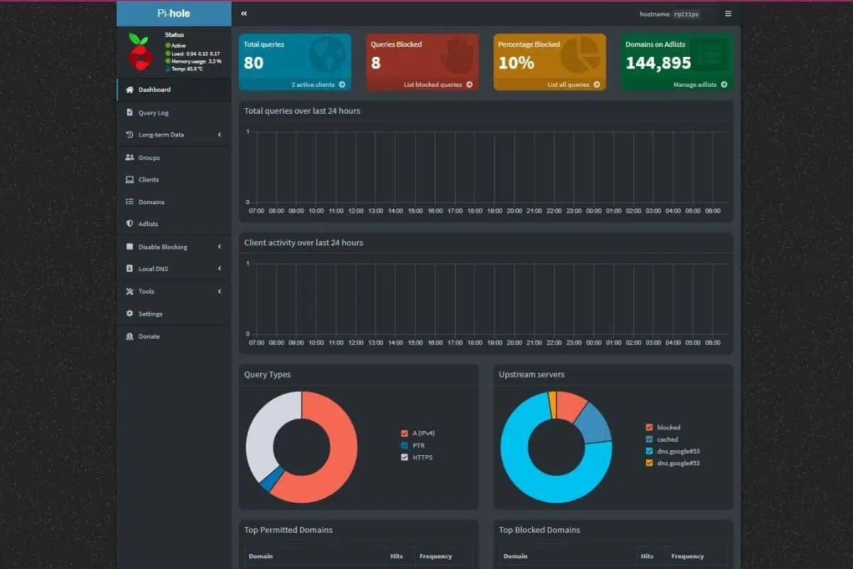 Una vez dentro, el panel principal muestra estadísticas muy visuales sobre peticiones totales, dominios bloqueados, porcentajes de bloqueo y los clientes que más consultan el DNS. Es una buena forma de verificar, en cuestión de segundos, que la Raspberry está respondiendo peticiones y que el filtrado está activo.
