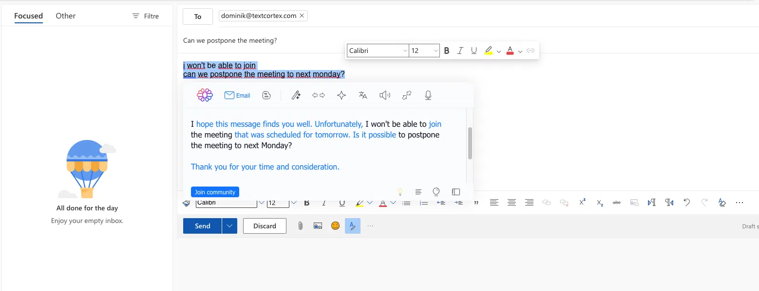 En el ecosistema Office, donde conviven Word y Outlook (tanto en la versión de escritorio como en la web), TextCortex aporta agilidad para redactar documentos, emails, informes y contenidos de marketing sin perder el foco en la calidad ni en el posicionamiento orgánico.