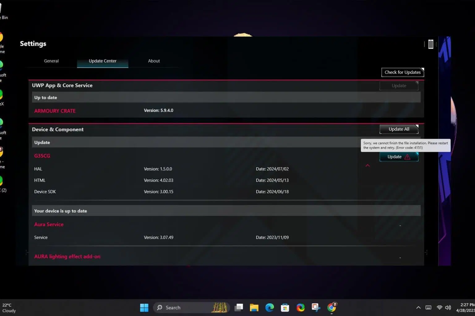 Si Armoury Crate no detecta un periférico nuevo o faltan opciones, empieza por actualizar desde su Centro de actualizaciones (icono de engranaje > Update Center > «Buscar actualizaciones»). Armoury Crate descarga módulos específicos para cada dispositivo, así que sin ese paquete el hardware no mostrará opciones RGB ni ajustes avanzados.