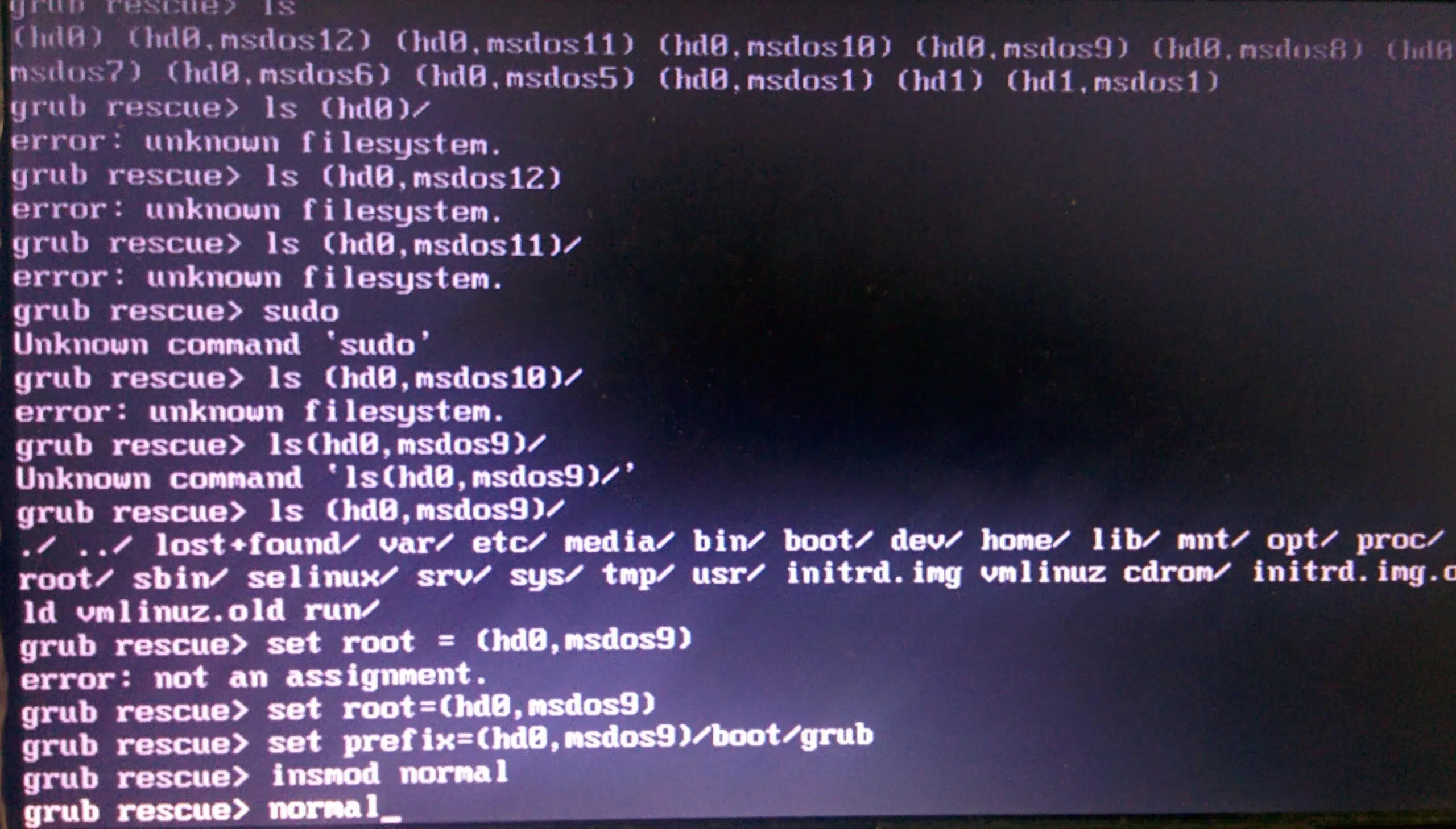 Fíjate que en el primer comando se indica a GRUB dónde están sus archivos internos (prefix), y en el segundo se fija la partición raíz donde se encuentra el sistema de arranque. Después se intenta cargar el módulo normal con insmod normal y, si todo va bien, se invoca el modo normal con normal, lo que hace que vuelva el menú de GRUB de siempre.