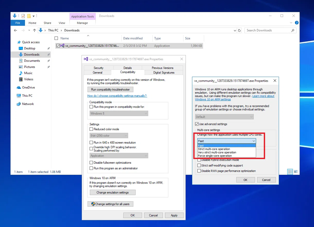 Si solo existe instalador x86/x64, prueba a ejecutar el solucionador de compatibilidad y ajusta la emulación (desactivar caché, desactivar CHPE, mayor estrictez multicore). Si la app requiere un driver o inyecta extensiones del shell, probablemente necesites una versión específica para Arm64 de esos componentes.
