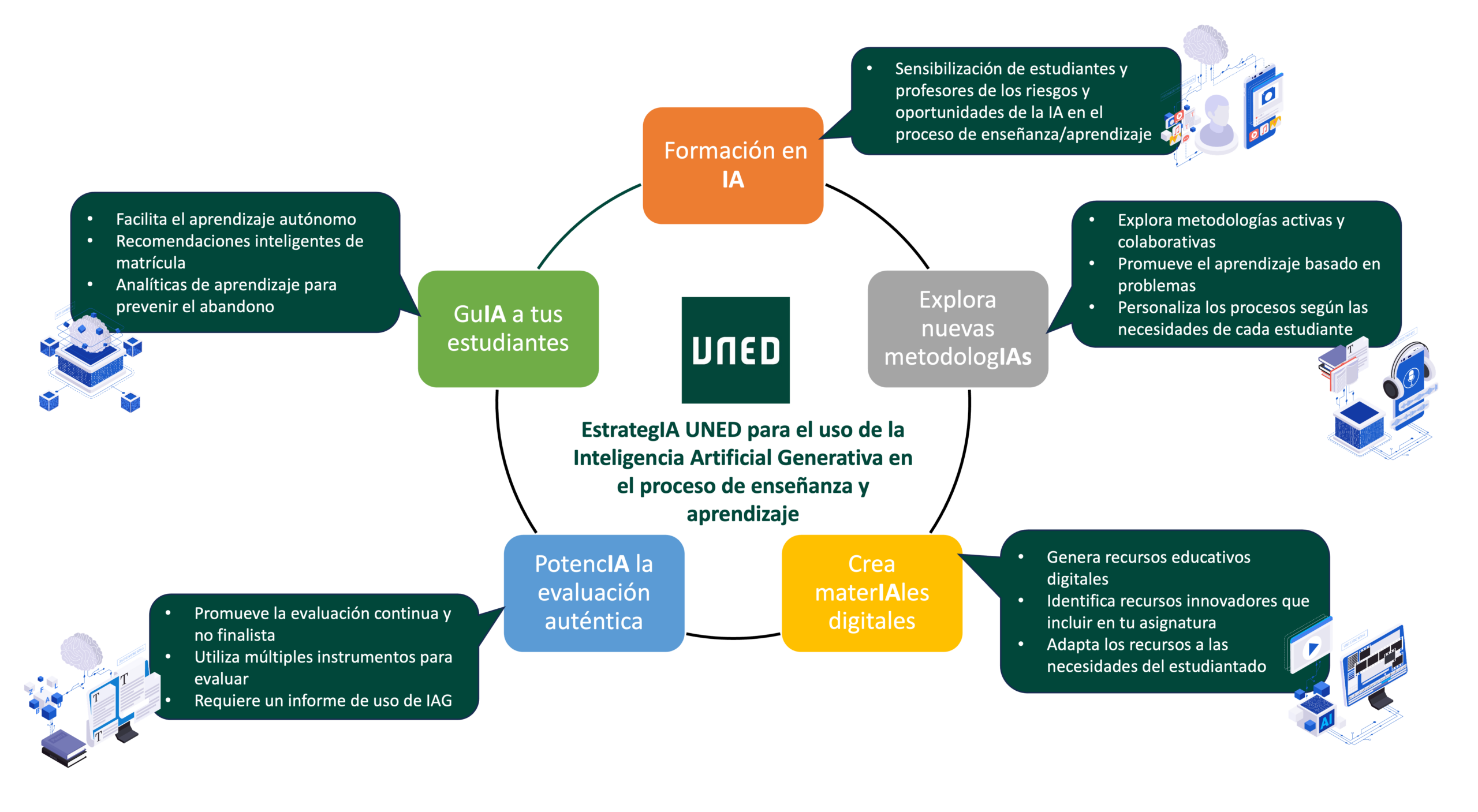 Esta estrategia se concreta en varias líneas de actuación: elaboración de guías sobre IA generativa dirigidas a profesorado y alumnado, organización de cursos y talleres de formación (muchos de ellos impartidos por el Instituto Universitario de Educación a Distancia, IUED), y desarrollo de proyectos de innovación educativa que integran IA en plataformas y servicios de la UNED.