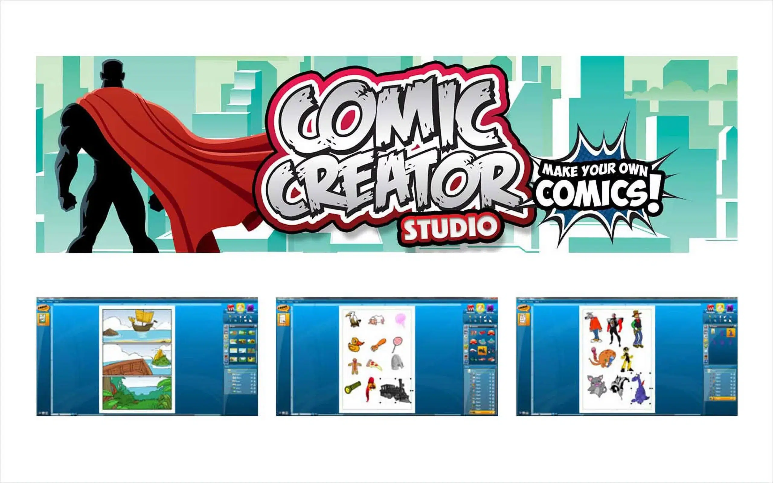 • Comic Creator Studio está muy enfocada a quienes empiezan, con 36 diseños de panel, 50 personajes (cinco poses cada uno) y más de 600 accesorios, además de fondos y elementos prediseñados para montar escenas rápidamente; puedes importar TIFF y PNG propios, pero su ausencia de herramientas de ilustración avanzadas lo hace limitado para usuarios con ambición artística; ronda los 44,99 € y no suele ofrecer prueba.