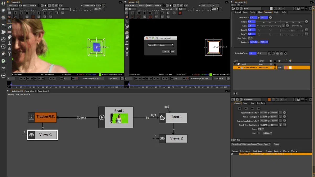 En cuanto al motion tracking profesional con Natron, el programa ofrece nodos de seguimiento 2D clásicos que permiten rastrear puntos de la imagen y aplicar ese movimiento a otros nodos (por ejemplo, a un Transform o a un CornerPin). Además, gracias a OpenFX, se pueden integrar soluciones de terceros para tracking más sofisticado, o bien importar datos generados desde programas especializados de matchmoving, encajando perfectamente en un pipeline profesional.