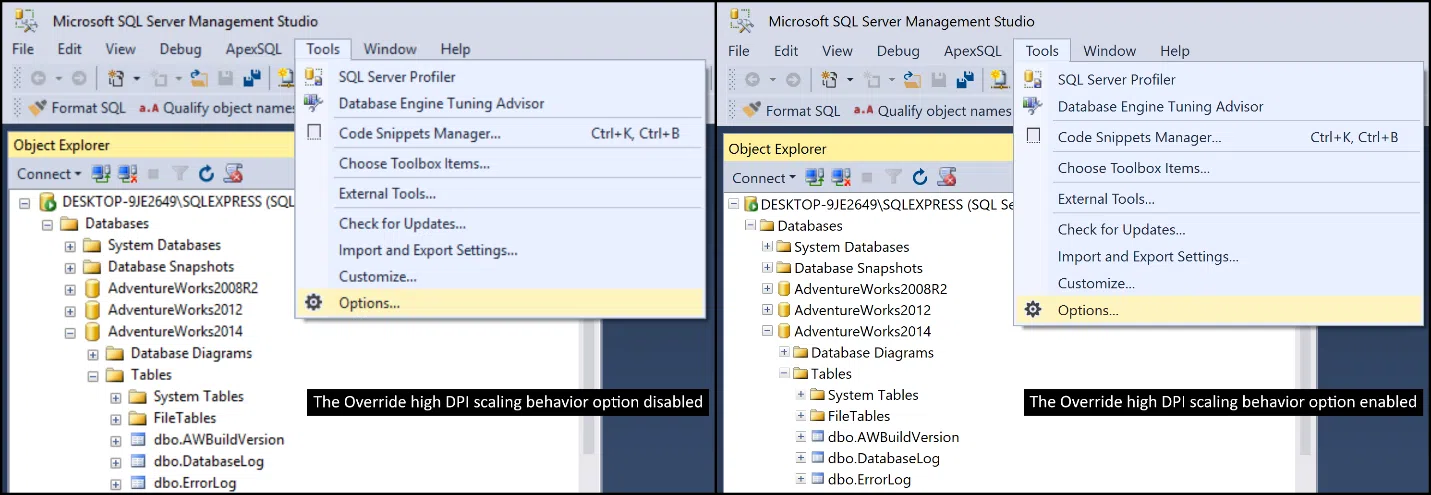 SQL Server Management Studio mejoró con el tiempo, pero durante mucho estuvo a medio camino con HiDPI. Hay dos rutas conocidas para ganar nitidez: forzar un manifiesto externo y usar la anulación de escalado en compatibilidad.