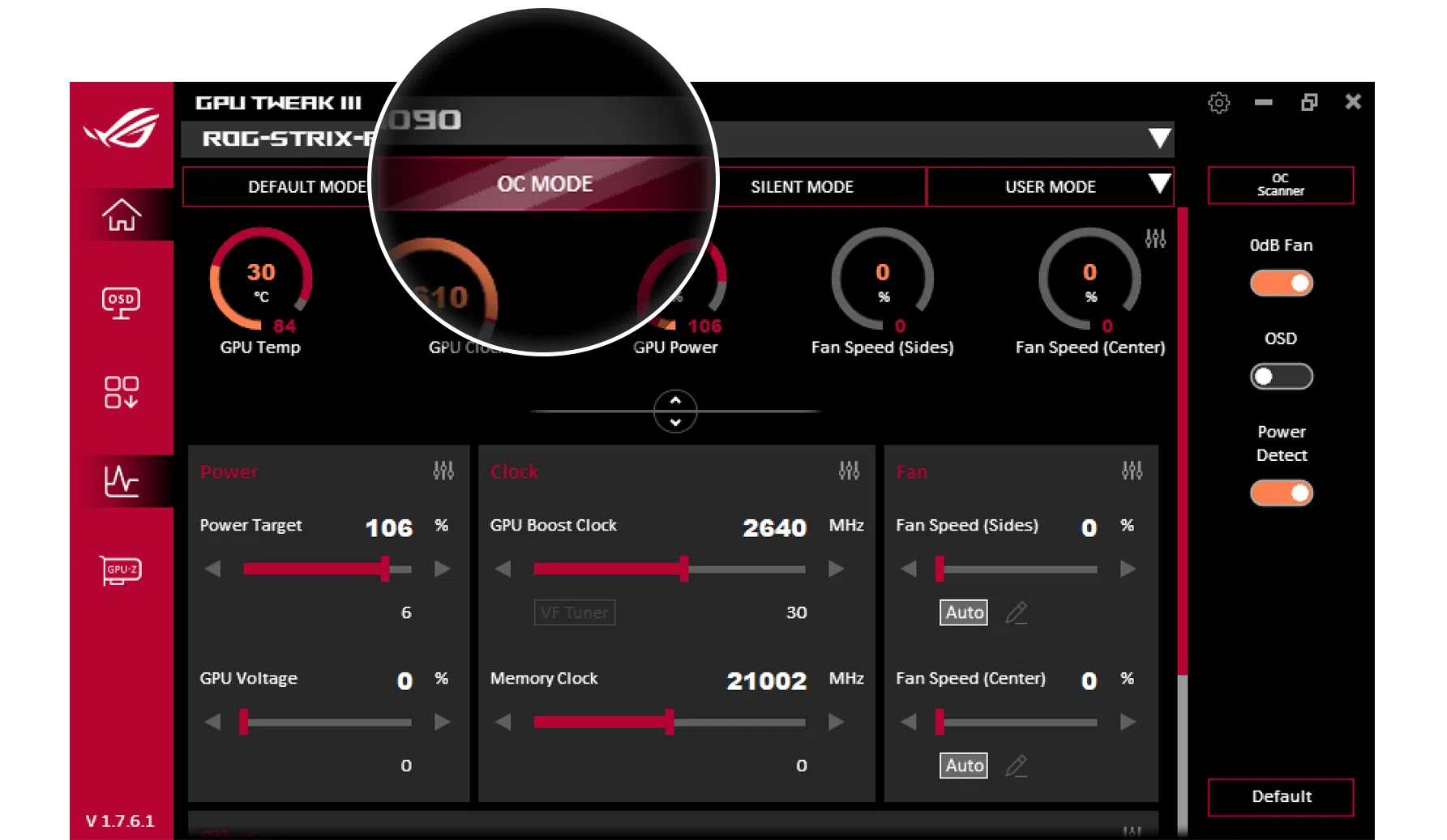 La vista principal de la derecha agrupa los controles esenciales de overclocking y ventiladores, además de los modos predefinidos y OC Scanner. Desde aquí podrás cambiar de modo con un clic, modificar frecuencia o consumo y activar el OSD para monitorizar el comportamiento de tu gráfica mientras juegas.