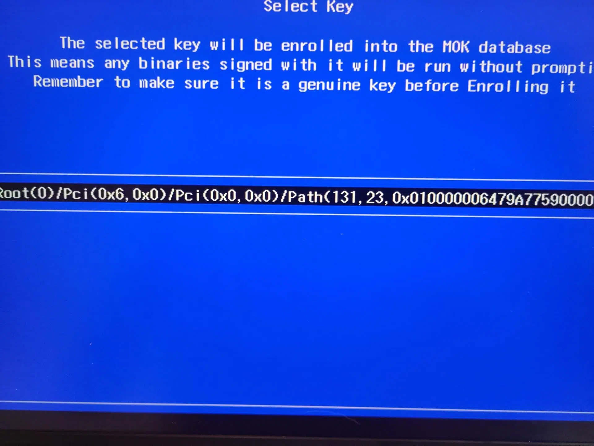Cuando ves esa famosa pantalla azul tipo “BIOS” en la que se menciona MOK Manager, lo que estás ejecutando es un pequeño programa EFI (normalmente el fichero mmx64.efi) encargado de gestionar las Machine Owner Keys. Este programa se lanza justo después de que hayas solicitado algún cambio en la configuración de las claves de arranque.