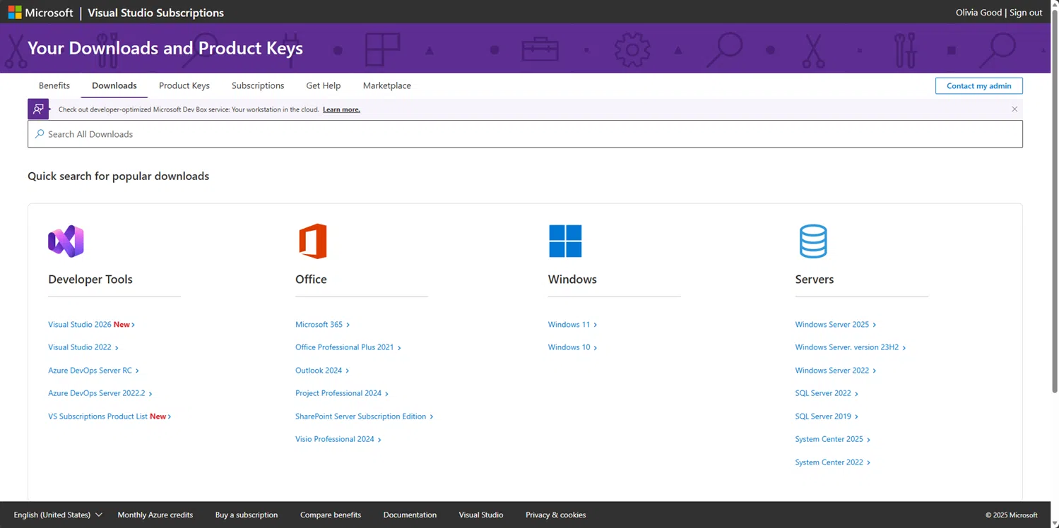En el apartado de descargas de productos, los suscriptores pueden acceder a un catálogo de software para uso exclusivo en desarrollo y pruebas. Esto incluye versiones actuales e históricas de Windows, Office y diversos productos de servidor (como SQL Server o Windows Server), de forma que es posible reproducir entornos de clientes, validar compatibilidades o montar laboratorios internos sin consumir licencias de producción.