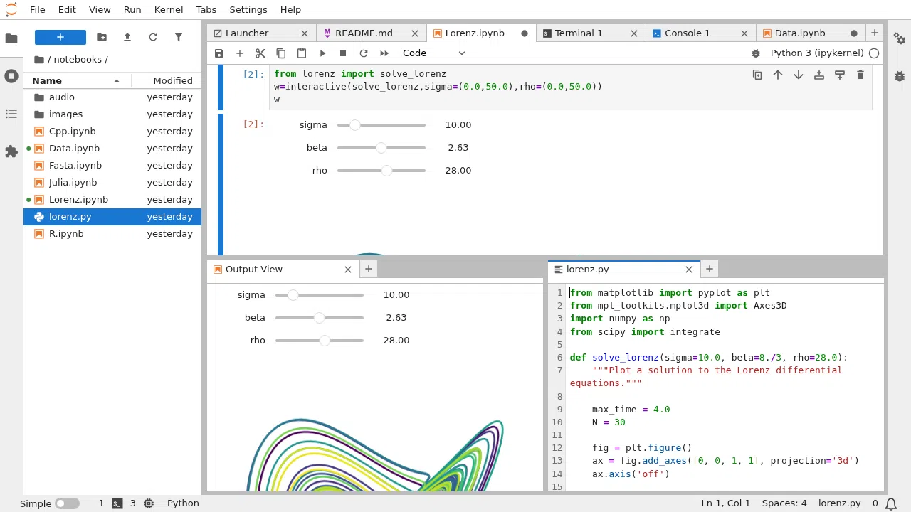 - Espacio de trabajo unificado: notebooks, editores de texto, vistas de imágenes, PDF, CSV, consolas y terminales, todo bajo la misma interfaz y con posibilidad de ver varios elementos a la vez.