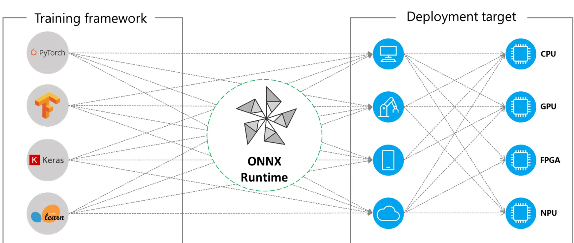 - ONNX Runtime permite ejecutar modelos ONNX de forma rápida y multiplataforma, aprovechando CPU, GPU, NPU y otros aceleradores.